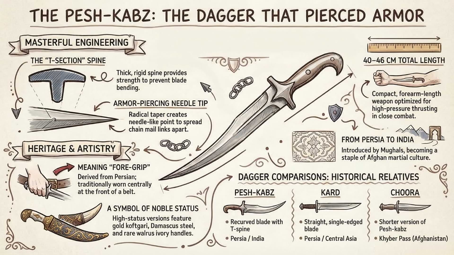 Bob DeMarco: The Pesh Kabz. Imagine a knife built for one very specific job. Not chopping wood, not carving meat, not even slashing in a duel, but punching through armor. That's the story of the Pesh Kabz, a knife born in Persia and carried across Afghanistan and Northern India, where its shape was refined into something almost surgical. Even the name hints at how closely it was worn. In Persian, Pesh Kabz refers to a blade worn in the front of the body, close, ready, and intimate. And that tells you everything about its purpose. This was no camp knife. This was the knife you carry when trouble was already near.